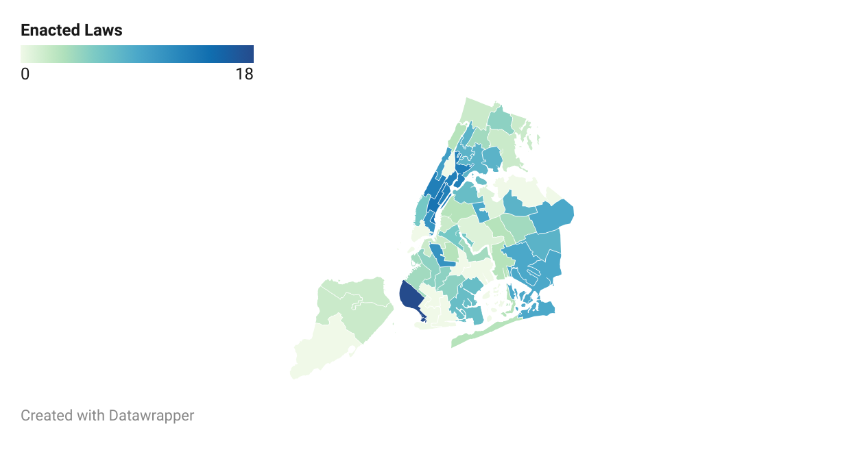 Every year, scores of bills are proposed by City Council Members and introduced into the New York City Council. Most of them will not pass, and then become local laws. A recent look at the 2022-2023 legislative session shows that 288 bills and 1 charter referendum were passed and and became enacted local laws. Who successfully and who unsuccessfully, got bills passed? The split between East Harlem and Central Harlem could not be more dramatic.