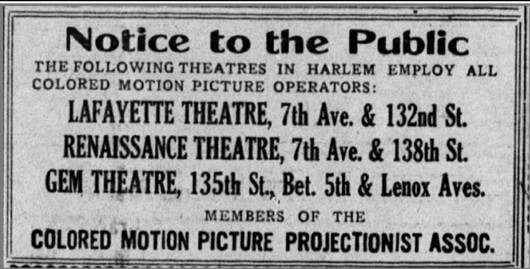 Notice to the Public in the “New York Age,” April 1926, from Black Cinemagoing